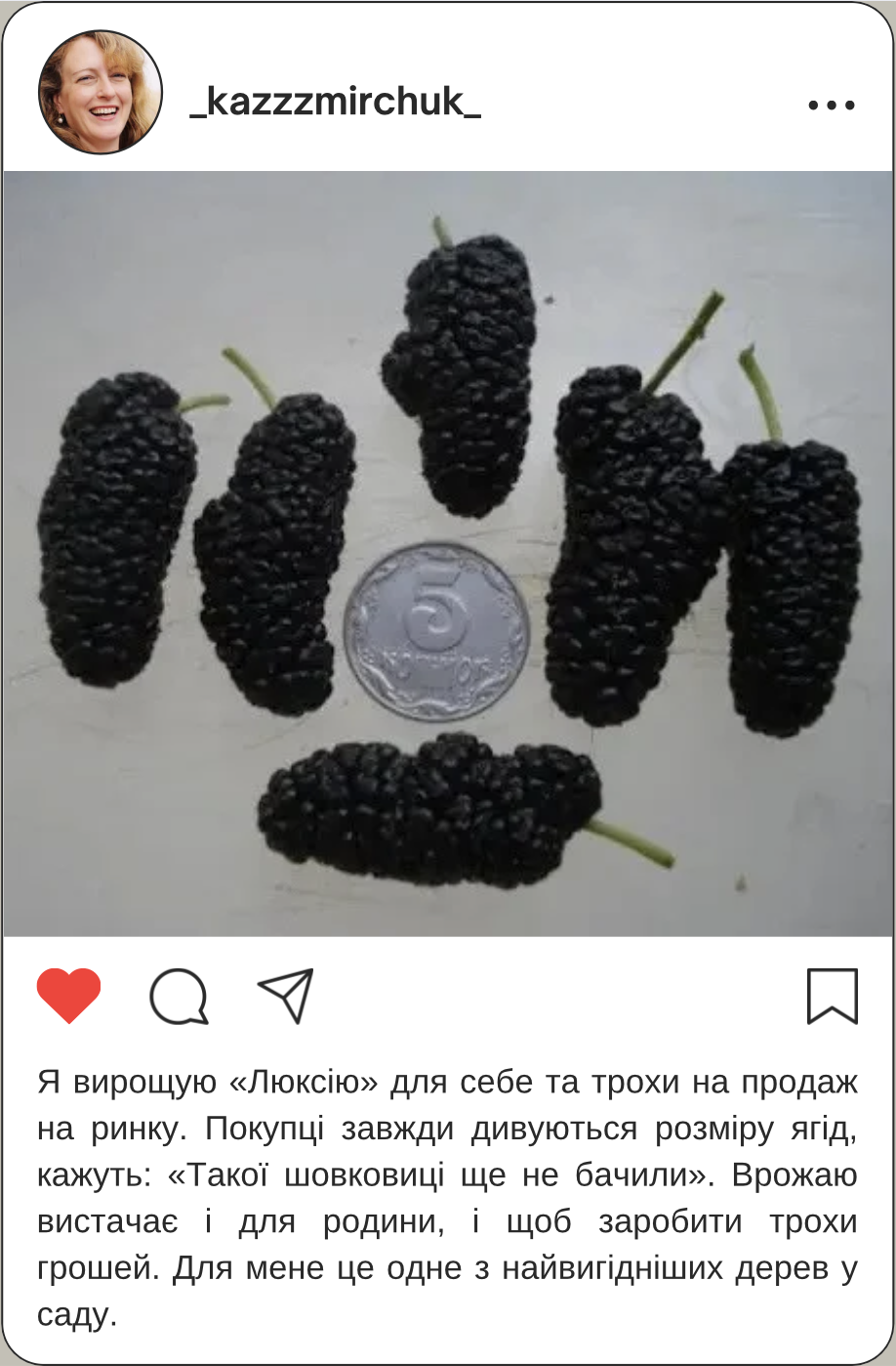 Вирощена з любов’ю шовковиця «Люксія» відзначається багатим смаком, розміром плодів та високою врожайністю й гарантовано стане джерелом літніх смаколиків
