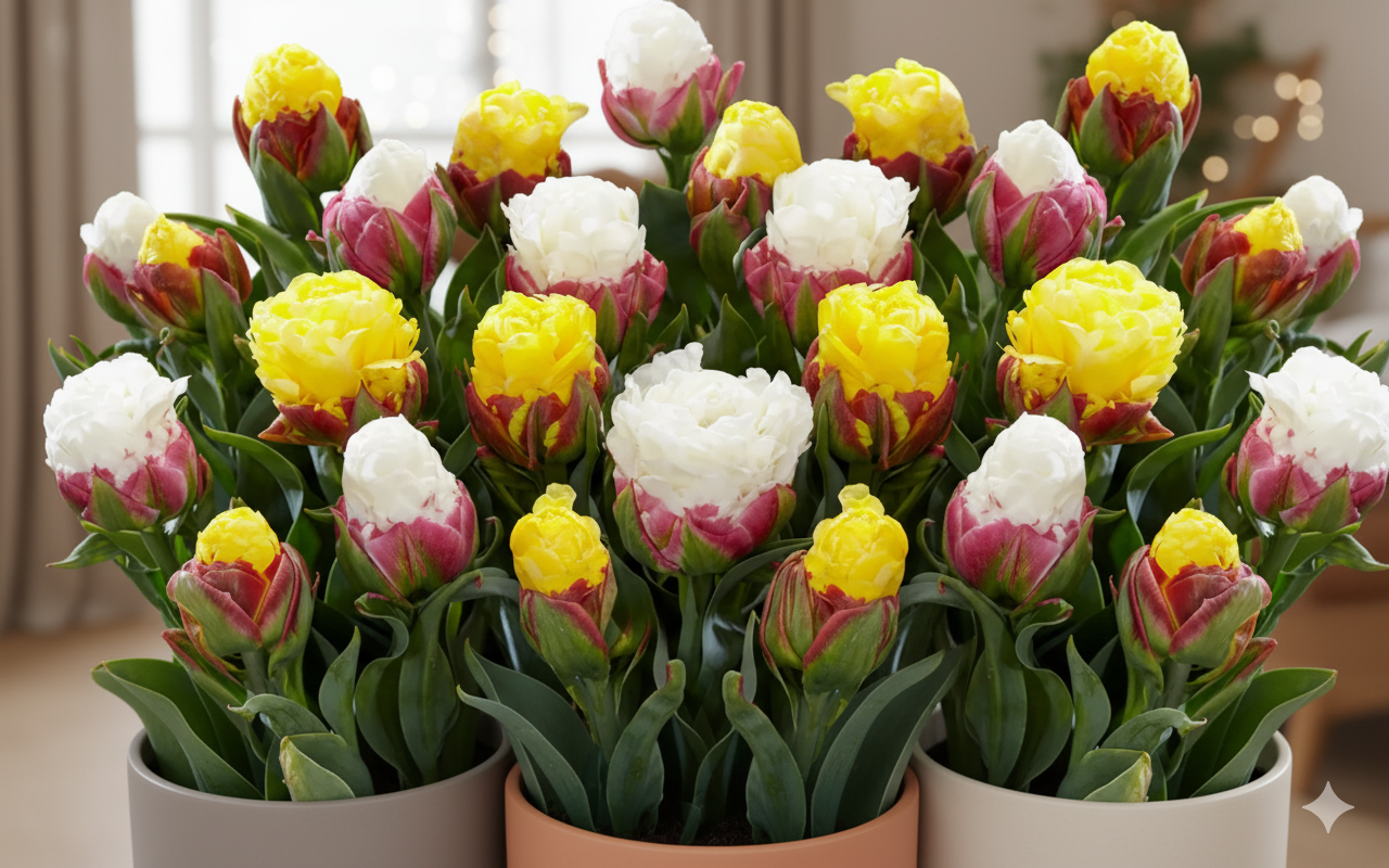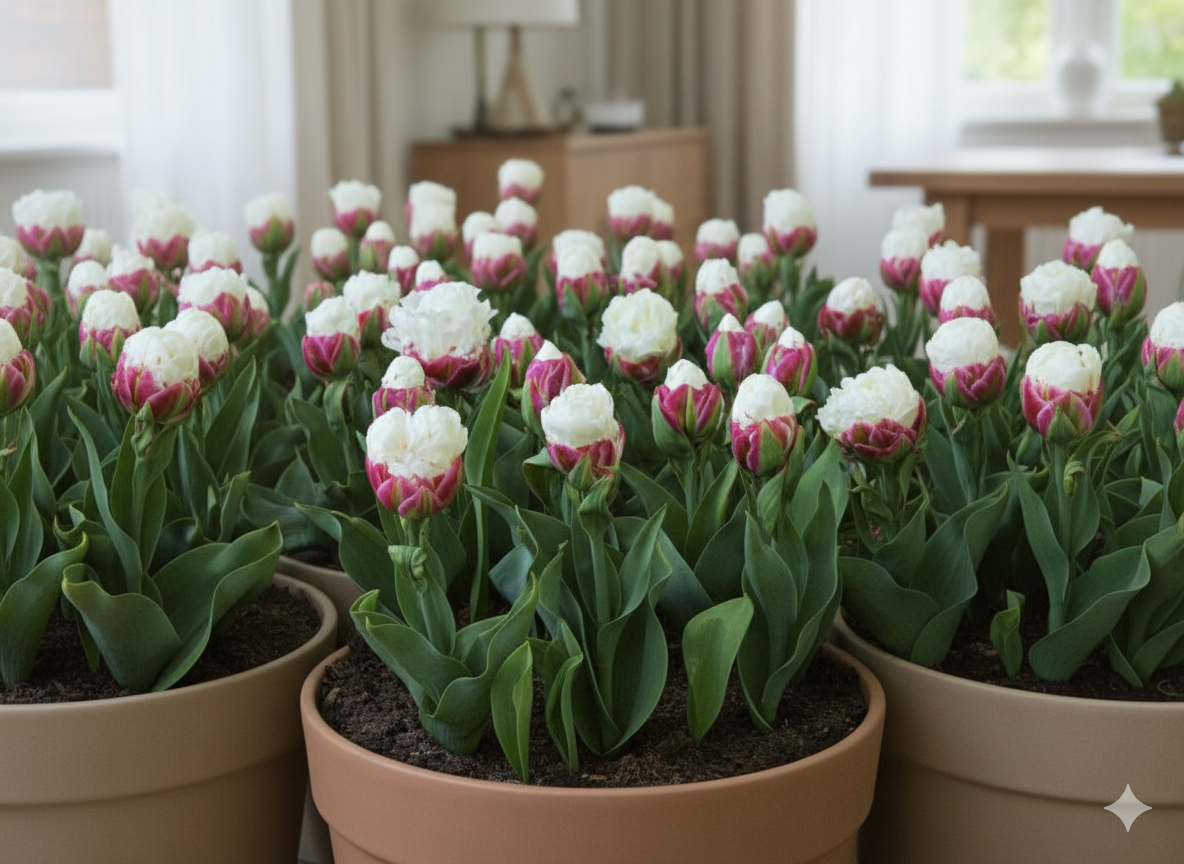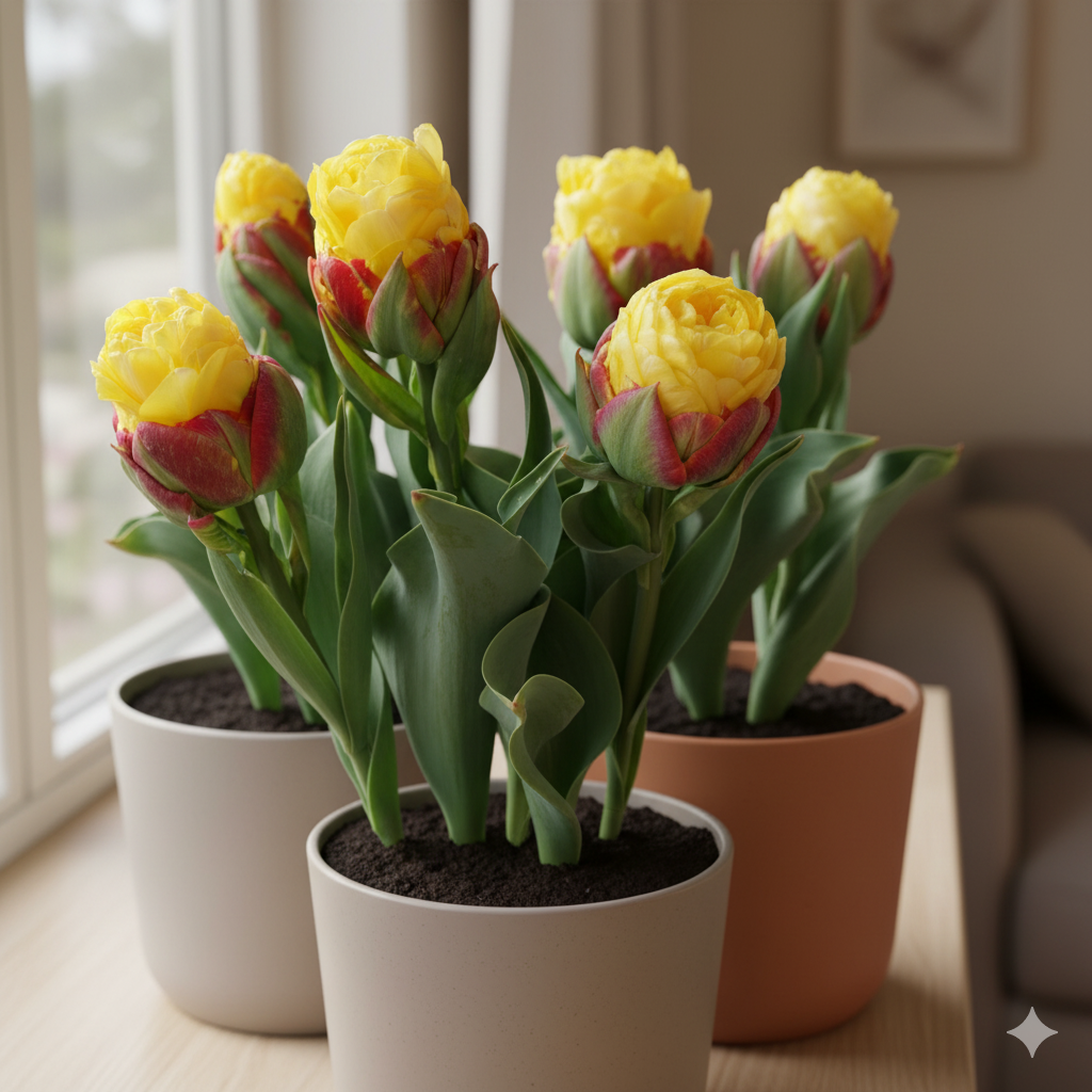 Для успішного вирощування тюльпанів «Ice Cream» у кімнатних умовах оберіть світле місце з м’яким, розсіяним освітленням.